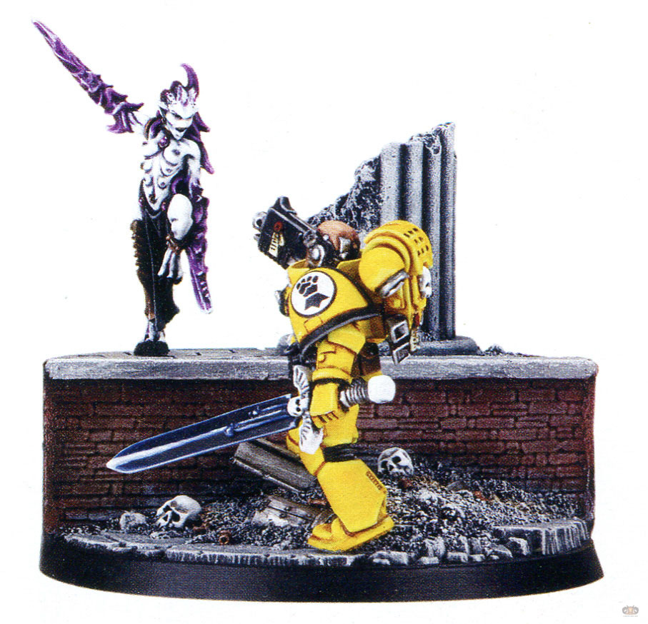 Martin Peterson won their 1st Golden Demon with the entry Imperial Fist Vs Daemonette in the Duel category at Games Day, Birmingham, 2002.